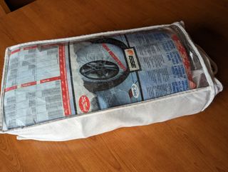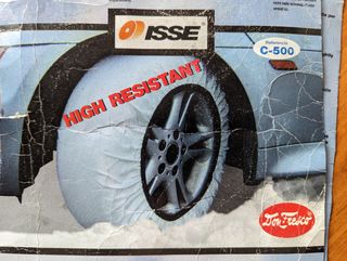 Funda textil para nieve y hielo. Valido para cualquier tipo de neumáticos dependiendo de la medida. Contiene guantes para su montaje. Sin estrenar. Abierto por primera vez para foto
