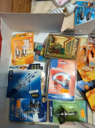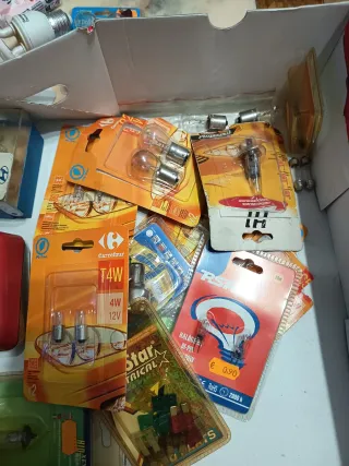 Se vende lote de repuestos para coche, incluyendo varias bombillas y fusibles. - Bombillas T4W 4W 12V. - Bombillas halógenas. - Fusibles de diferentes amperajes (rojos, verdes).