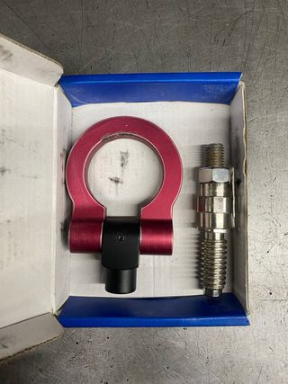 Anilla para remolcar coches, de acero. Usada, pero en buen estado, con algunas marcas de desgaste que no afectan a su uso. En color roja y negra. Muy usada en drift, tuning, rally. Dale un toque racing a tu vehículo.