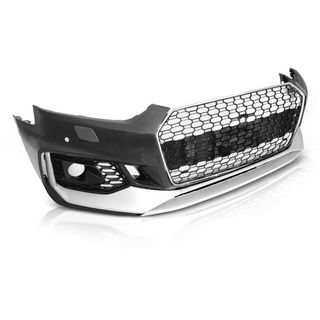 Paragolpes delantero look RS5 Silver Edition para Audi A5 Coupe y Sportback Adecuado para versión / modelo 5F de 2017 en adelante Incluye: Parrilla central RS5 Cromada Orificios para PDC Porta lamparas de antinieblas Cubierta de luz antiniebla Rejillas laterales Soporte para logo cubierta del gancho de remolque Porta matrícula Labios / lips de parachoques plateados Fabricado en ABS.