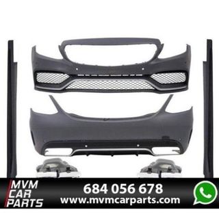 Kit de carrocería completo con escapes para Mercedes Clase C W205 Sedan de 2014 en adelante Valido para: Mercedes W205 Clase C Sedan (2014+) Incluye: Paragolpes delantero completo con soportes, rejilla central baja, rejillas laterales, molduras cromadas, soportes Pdc y cubierta de gancho de remolque Taloneras laterales con añadido Paragolpes trasero con difusor tipo C63 y salidas de escape fabricadas en acero inoxidable.