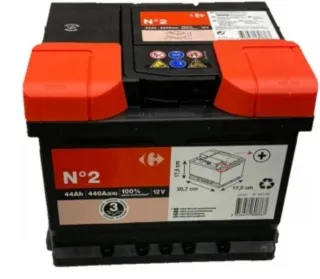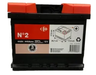 Batería de coche Carrefour N°2. - Capacidad: 44Ah - Potencia de arranque en frío (EN): 440A - Voltaje: 12V - Dimensiones: 20,7 cm x 17,5 cm x 17,5 cm - Sin mantenimiento.