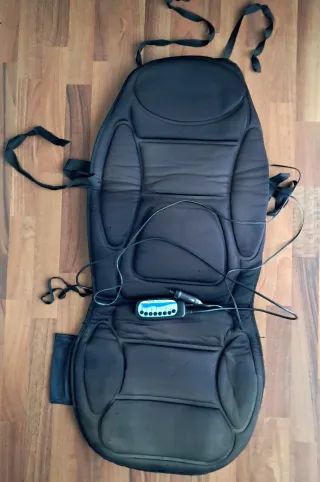 Cojín masaje y calor. Te proporciona un masaje relajante, con distintas velocidades de vibración en zona espalda, lumbar y gluteos. Cojín con función calor. Lleva un mando para el control del masaje, intensidad, zona, etc y del calor, con adaptador para utilizar en el coche y en casa.