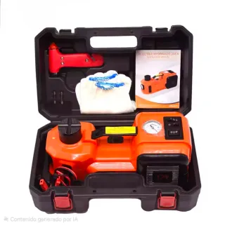 Este gato hidráulico eléctrico es una herramienta práctica para tu coche. - Compresor inflador para ruedas - Incluye un martillo rompecristales. - Viene con guantes de protección. - Manual de instrucciones. - Funciona a 12V.
