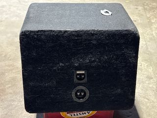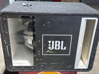 Caja para subwoofer JBL con diseño robusto y acabado en moqueta. - Ventana transparente para ver el altavoz. - Puerto bass reflex. - Logo JBL en la parte frontal.