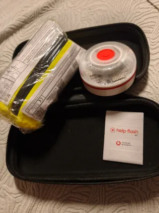 Estuche con baliza de emergencia y chaleco reflectante. - Baliza luminosa con base magnética. - Chaleco de alta visibilidad. - Incluye folleto de instrucciones Help Flash IoT.