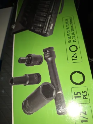 Set de vasos de impacto JBM de 1/2 pulgada. Incluye 15 vasos. - Fabricados en acero de alta resistencia. - Diseño para uso con llaves de impacto. - Estuche metálico para almacenamiento.