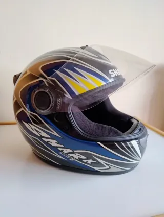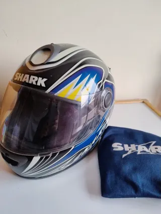 Casco integral Shark RSF2 con diseño deportivo y visera. Con estructura de fibra y resina epoxi. Es el caso réplica de Randy de Puniet. Tiene sus años, y está usado pero en su día era un casco de calidad. Me costó más de 220 euros de entonces. Con la firma de Toni Elías que conseguí en un gran premio de Moto GP en Aragón. Está usado y tiene sus marcas. Incluye saco de transporte original. - Color negro, azul y plateado. - Talla L, 58-59 cm.
