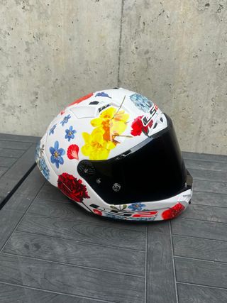Casco de moto LS2 Thunder GP Carbon con un diseño floral blanco y colorido. Ideal para quienes buscan estilo y protección. - Diseño floral blanco con flores rojas, amarillas y azules. - Visera oscura. - Marca LS2.