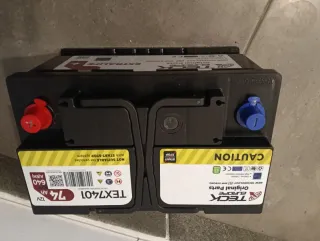 Batería de coche TECTEX7401 de 12V, 74Ah y 640A. - Modelo: TEX7401 - Voltaje: 12V - Capacidad: 74 Ah - Corriente de arranque en frío (EN): 640A - Tecnología: SMF STRONG - No apta para vehículos con sistema Start-Stop.