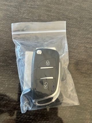 Llave de repuesto para vehículos Peugeot y Citroen. Incluye 2 botones para funciones de apertura y cierre. - Diseño moderno y compacto. - Carcasa negra resistente. - Anilla metálica para llavero.
