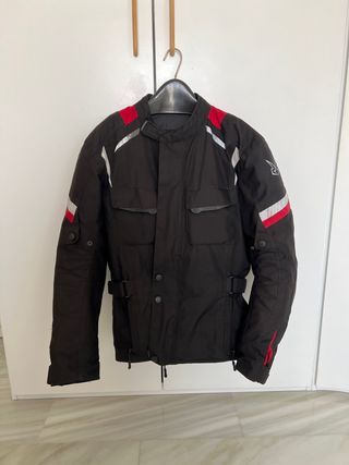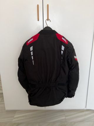 Chaqueta de moto negra con detalles reflectantes y rojos. - Talla M - Cierre frontal con cremallera y botones. - Protecciones en codos, hombros y espalda. - Forro térmico desmontable. - Dos bolsillos frontales con solapa. - Ajustes en cintura y mangas. - Detalles reflectantes en hombros y brazos.