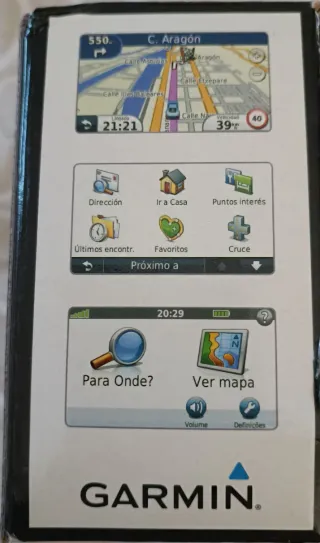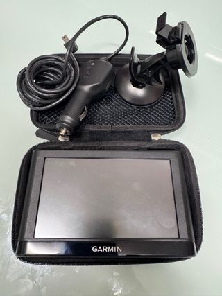 Navegador GPS Garmin para coche, ideal para tus viajes. - Pantalla de navegación. - Soporte con ventosa. - Cargador para coche. - Cable USB. - Funda protectora.