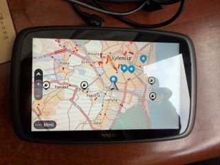 Navegador GPS TomTom en color negro, ideal para tus viajes. - Pantalla de navegación. - Incluye cargador para coche.