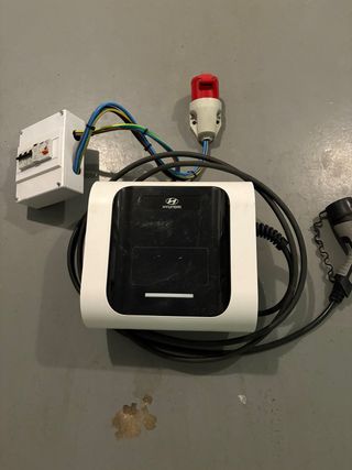 Estación de Carga VE. Cargador para vehículo eléctrico de la marca Hyundai. Incluye cable, enchufe y caja diferenciales.