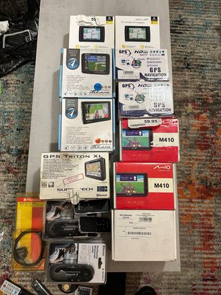 Se vende lote de dispositivos GPS de diferentes marcas. - GPS Takara 3.5 GP34 - GPS Takara 4.3 GP738 - GPS Triton XL - GPS Mio M410 (2 unidades) - GPS HD Navigation (2 unidades) - Accesorios Phonocar - Manos libres Bluetooth Gembird (2 unidades)