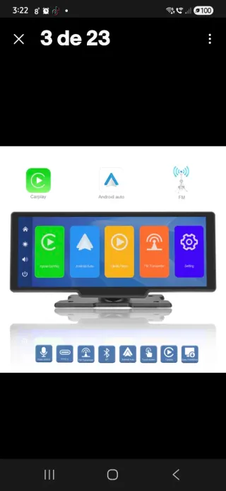Pantalla inalámbrica compatible con Android Auto y Apple CarPlay. - Pantalla táctil. - Transmisor FM. - Conexión Bluetooth. - Puerto Tipo C. - Control por voz. - Fácil instalación.
