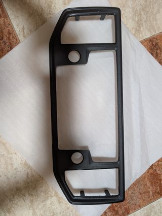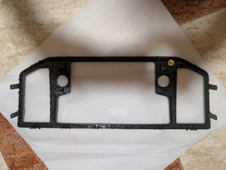 Marco frontal para la radio de una VW Crafter. Pieza de plástico negro. - Diseño rectangular con aberturas. - Dos orificios circulares. - Clips de sujeción integrados.