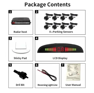 Sistema de radar de aparcamiento para coche con 8 sensores. Incluye caja de control principal y pantalla LED. - 8 Sensores de aparcamiento blancos. - Caja de control principal. - Pantalla LED. - Interfaz estándar para sonda de radar.