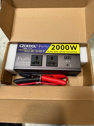 Inversor de potencia Czckool de 2000W, ideal para convertir corriente continua de 12V a corriente alterna de 220V. - Potencia continua de 1000W. - Potencia pico de 2000W. - Salida de onda sinusoidal pura. - Incluye pinzas para conexión a batería.