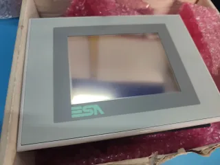 Pantalla táctil con marco gris y logo ESA. - Panel HMI - Diseño moderno. - Interfaz intuitiva.