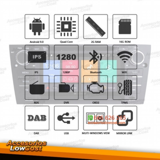 REF: AL022292 Navegador Multimedia GPS Android 11 HD Táctil para BMW Serie 3 E90/E91/E92/E93 Este sistema multimedia ha sido diseñado específicamente para modelos BMW Serie 3 (E90, E91, E92 y E93), permitiendo una integración perfecta en el salpicadero y ofreciendo una experiencia completa de navegación, entretenimiento y conectividad. Diseño y compatibilidad Instalación específica para BMW Serie 3 (modelos E90/E91/E92/E93). Compatible con controles del volante. Medidas: 268 x 240 x 115 mm. Pantalla táctil Full HD Pantalla capacitiva de 7 pulgadas con tecnología IPS. Resolución 1024x600, compatible con contenido Full HD