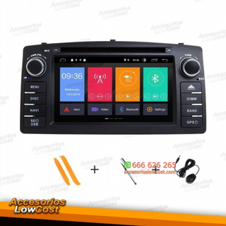 REF: EL000023 RADIO NAVEGADOR MULTIMEDIA ANDROID 11.0, GPS DVD 7" HD, específico para TOYOTA COROLLA (2002-2008). Características generales: Sistema operativo Android 11.0. Pantalla táctil capacitiva de 7 pulgadas. Resolución de pantalla: 1024x600, Full HD con tecnología IPS. Procesador: CPU de cuatro núcleos de 1,6 GHz. Dimensiones del producto: 217 x 100 x 124 mm (formato 2DIN). Memoria: 2 GB de RAM DDR3 y 16 GB de ROM (memoria interna). Reproductor de CD. Reproduce múltiples formatos: MP3, MP2, WMA, WAV, ACC, MP4, AVI, FLV, 3GP, DAT, DIVX, MPEG, SVCD, VCD, XVID, JPEG. Puerto USB y SD hasta 64 GB de memoria externa.