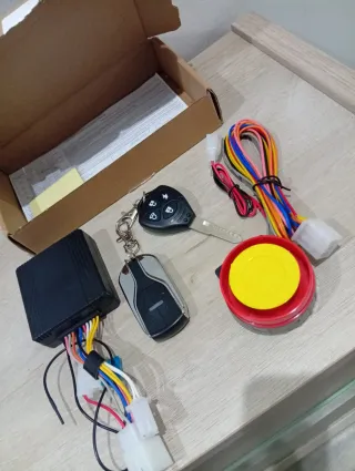 Sistema de alarma para moto, diseñado para proteger tu vehículo contra robos. Incluye todos los componentes necesarios para su instalación. 12V - Centralita de alarma. - Dos mandos a distancia. - Sirena. - Cableado y conectores.