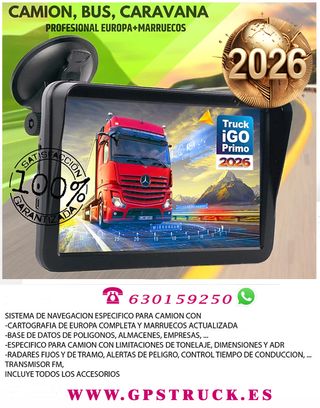 NAVEGADOR GPS, con sistema IGO PRIMO para CAMION. Actualizado a 2026 Nuevos, GPS 7, 8 y 9 Pulgadas, multimedia HD. Europa y Marruecos en 3D instalado (el mejor del mercado) con últimos mapas de Europa al completo, todos los radares recién actualizados, más de 1 millón de firmas y empresas, todos los Polígonos Industriales, edificios en 3D, relieve 3D etc. modo navegación: -CAMION, coche, bus, taxi- se puede ajustar: largo ancho, peso, ejes, tipo de carga etc el paquete contiene: GPS, cargador Camión 12-24v, cable USB, soporte,ventosa, manual. PRECIOS: 7 pulgadas 95 €, 9 pulgadas 125 € GARANTÍA whatsapp 630159250. gpstruck.es