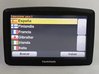 Navegador GPS TomTom XXL con mapas de Europa. - Pantalla grande para mejor visualización. - Interfaz intuitiva para seleccionar países. - Botones de 'Buscar' y 'Volver' para fácil navegación.
