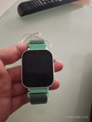 Reloj con GPS diseñado para niños. Incluye un cable de carga. - Correa de tela verde. - Pantalla táctil.