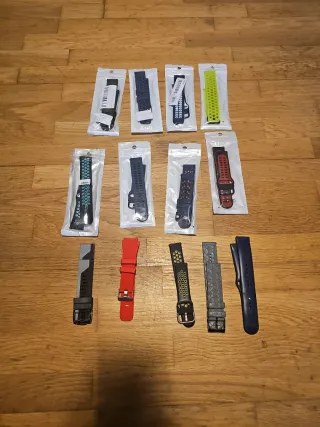 Lote de trece correas de 22mm para relojes o pulseras de actividad. Las que estan en la bolsita estan muy bien. Las de abajo tienen mas uso. - Variedad de colores y diseños. - Materiales diversos como silicona y otros. - Algunas vienen en su empaque original.