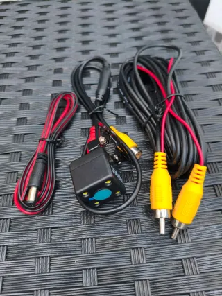 Cámara de visión trasera compacta, ideal para instalar en tu vehículo. - Incluye cables de conexión. - Conectores RCA amarillos. - Tamaño del cable: 5 m. - Dimensiones de la cámara: 2,5x2x5x2,5 cm