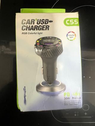 Cargador para coche con transmisor Bluetooth y múltiples funciones. - Modelo C55. - Pantalla digital. - Luces LED RGB. - Carga rápida PD y QC3.0. - Potencia de 30W.
