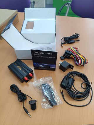 Sistema de rastreo vehicular GPS/SMS/GPRS. - Unidad principal del localizador GPS. - Antena GPS/GSM. - Micrófono. - Mando a distancia. - Cableado de conexión. - Relé. - Manual de usuario.