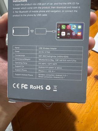 Solo válido para coches con Android Auto o CarPlay de serie y conexión por cable. Este adaptador convierte tu conexión a inalámbrica, mediante wifi y bluetooth. Está nuevo, se compró para Renault Clio pero no es compatible con R-Link. Probado y funcionando en Ford Focus y Seat Leon. Incluye adaptador USB-C.