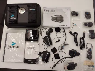 Kit de intercomunicador Cardo Scala Rider 03 MultiSet para motociclistas. Incluye todo lo necesario para su instalación y uso. - Dos unidades de intercomunicador. - Funda de transporte. - Manuales de instalación y guía rápida. - Auriculares y micrófonos. - Cables de carga USB. - Soportes de montaje.