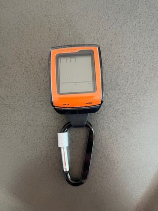 Estación meteorológica portátil Sensor Master IV, ideal para actividades al aire libre. - Pantalla digital. - Carcasa naranja y negra. - Incluye mosquetón para colgar.