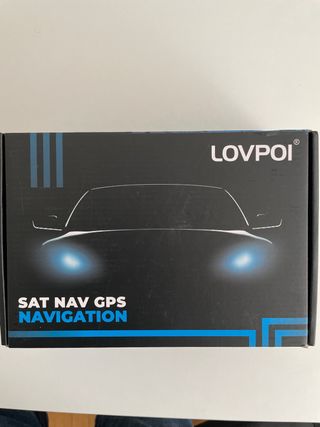 Sistema de navegación GPS SAT NAV de la marca LOVPOI. - Diseño moderno con silueta de coche. - Luces delanteras con efecto azul. - Texto SAT NAV GPS NAVIGATION en azul.