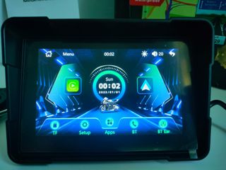 NUEVO. Sin usar conserva plástico protector pantalla. Carplay para moto con pantalla de 5" táctil completa capacitiva y para intemperie a prueba de agua con IP67. Muy robusta y gran calidad de brillo (800nits) y resolución Con soporte para manillar articulado (bola) y visera. Bluetooth,WiFi,USB y tarjeta SD. Compatible con Android Auto y Apple Carplay y poder usar las aplicaciones del móvil en el dispositivo, como por ejemplo Google Maps,reproductores,etc.