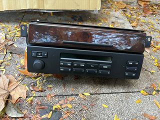 Radio original para BMW E39. Presenta un acabado en madera oscura y detalles en negro. - Panel frontal con pantalla LCD. - Botones de control de volumen, sintonización y modos. - Compartimento para CD.
