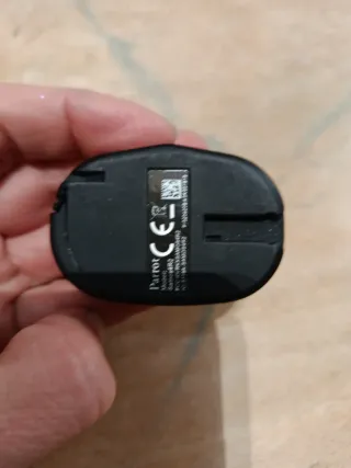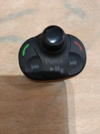 Mando a distancia para dispositivos Parrot. Diseño compacto y ergonómico. - Botones de control de llamadas (verde y rojo). - Botones de reproducción/avance/retroceso. - Dial giratorio central. - Logo de Parrot visible.