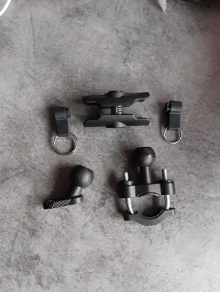 Conjunto de soportes para GPS de moto con sistema de seguridad. - Soporte de bola con brazo articulado. - Abrazadera para manillar con bola. - Base de sujeción con resorte y llave de seguridad.