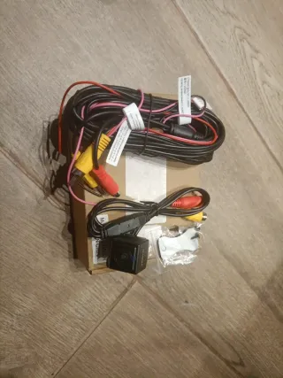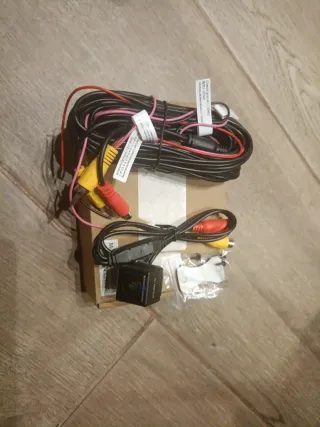 Cámara compacta para visión trasera de vehículos. Incluye cables de conexión y accesorios de montaje. - Cámara cuadrada negra. - Cables de vídeo y alimentación. - Soporte de montaje.