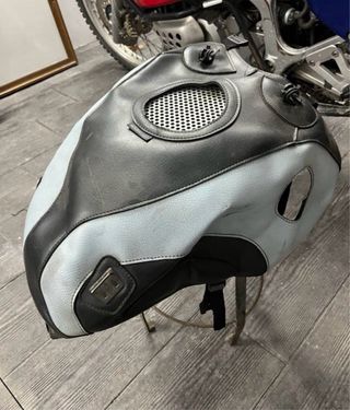 Funda para el depósito de motocicletas BMW R1100R y R850R. Fabricada en cuero sintético negro y gris, con detalles de rejilla y cierres de clip. desgastes del uso - Material: Cuero sintético. - Color: Negro y gris. - Cierres: Clips ajustable