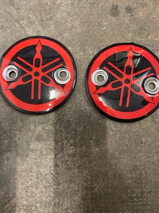 Juego de tapas para el cárter del variador de Yamaha TMAX. Diseño deportivo en negro y rojo con el logo de Yamaha validas para varios modelos - Dos tapas incluidas. - Logo Yamaha en rojo y negro. - Dos ojales metálicos cada tapa.