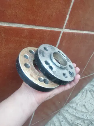 Separadores para Seat Ibiza 6L. Están hechos de metal y tienen un acabado plateado y negro. - Set de 2 separadores. Sin tornillos