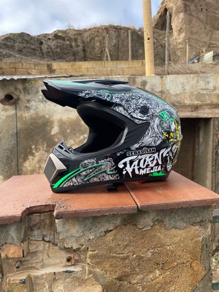 Casco de motocross con un diseño llamativo en negro y detalles tribales en verde. - Diseño gráfico en blanco y verde. - Visera aerodinámica. - Interior acolchado. se dan también unos guantes, las gafas y unas bragas para el cuello. el casco está nuevo