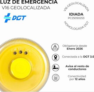 BALIZA V16 GEOLOCALIZADA DGT – OBLIGATORIA EN 2026 Sustituye los triángulos. Señaliza una avería sin salir del coche. ✔ HOMOLOGADA por la DGT (IDIADA PC25050253) ✔ Envío automático de ubicación a DGT 3.0 ✔ Conectividad garantizada hasta 2038 ✔ Imán potente, se coloca en 2 segundos ✔ Visible 360º hasta 1 km ✔ Resistente al agua (IP54) ✔ Tamaño compacto, ideal para guantera ✔ Incluye pilas ¡Evita multas y adelántate a la nueva normativa!