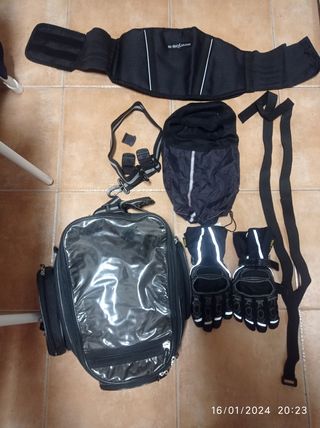 Lote compuesto por MOCHILA sobredepósito con imanes con todos sus accesorios( correas, funda lluvia...), GUANTES de Kevlar con Tejido interior de Thinsulate, FAJA LUMBAR, BRAGA ajustable para cabeza y cuello.
